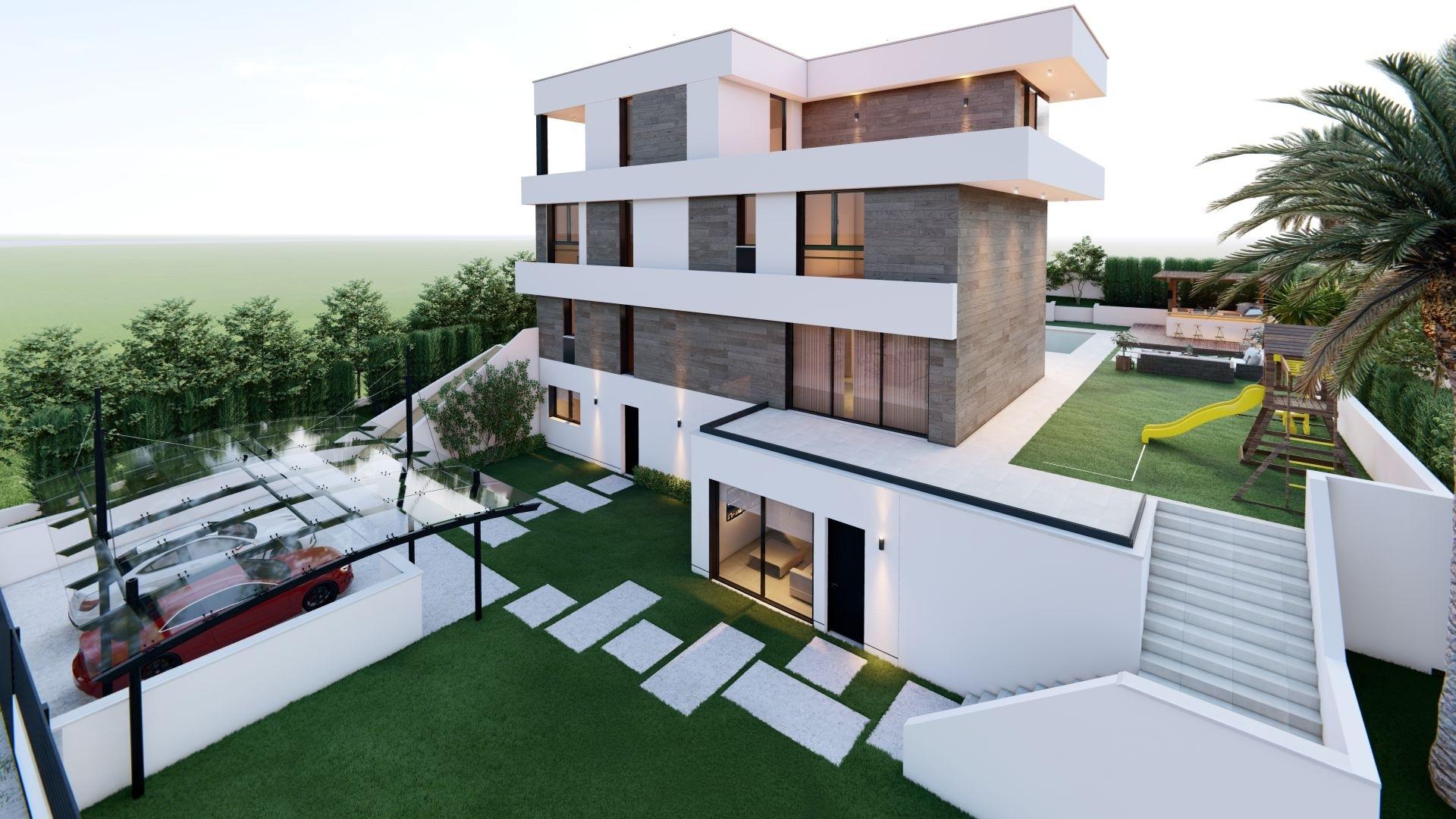 On the plot of 1,300 square meters, the house, with almost 360 meters, has a ground floor with living-dining room, kitchen, laundry room, guest toilet and garage for three cars, and a second floor with two bedrooms with dressing room and bathroom en suite, two other double bedrooms sharing bathrooms, plus large terraces that serve these more private areas.
