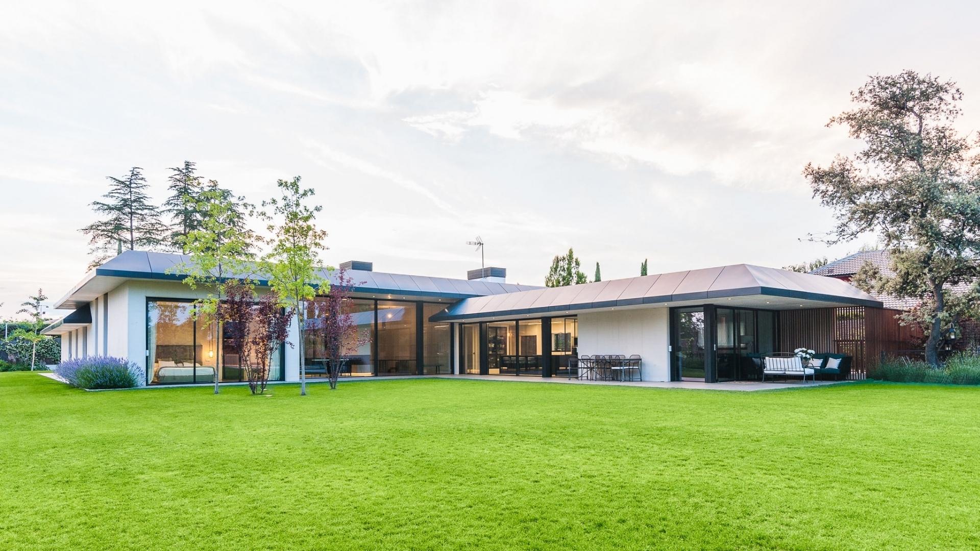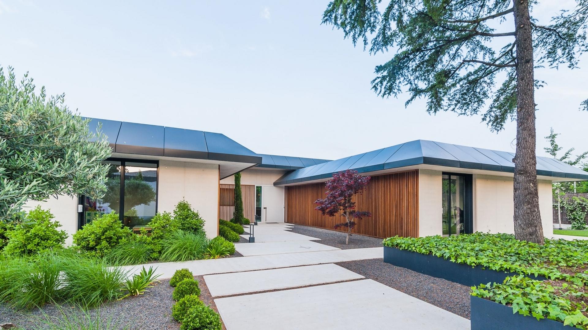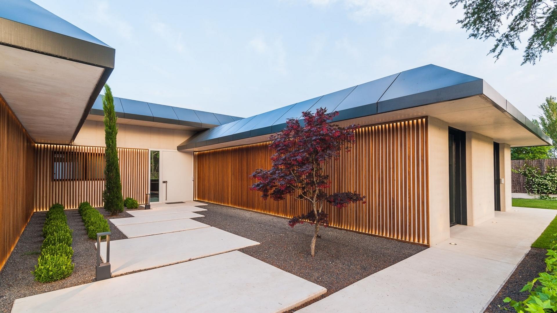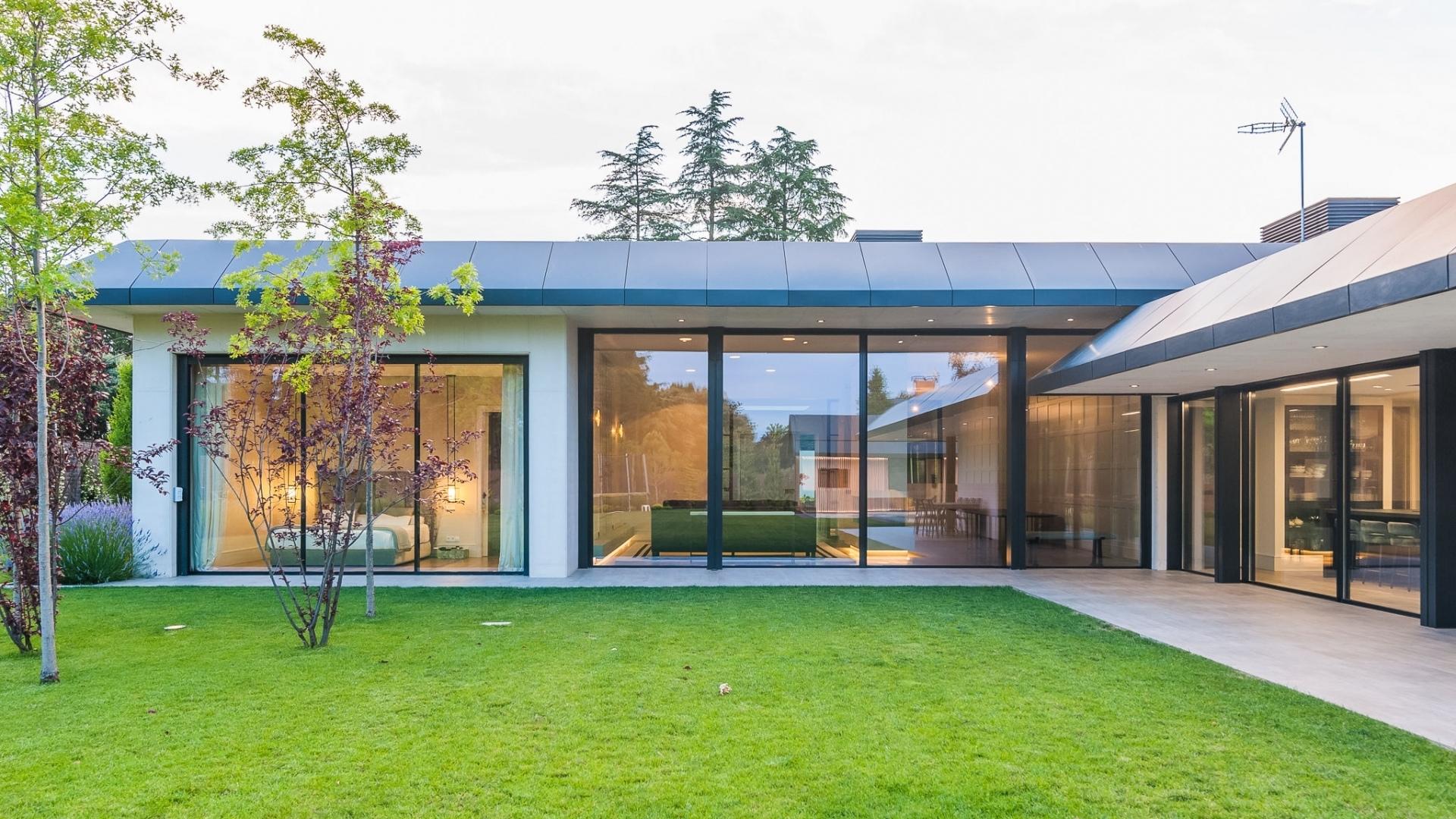 This "ad hoc" project villa, built in the well-known area of "La Moraleja", stands out for its unique white concrete enclosure in situ with stone corners, where the phenolic formwork was discarded after only one use and with a sloping roof where the eaves have been made with overlapping sheet metal developments in the form of dowels.