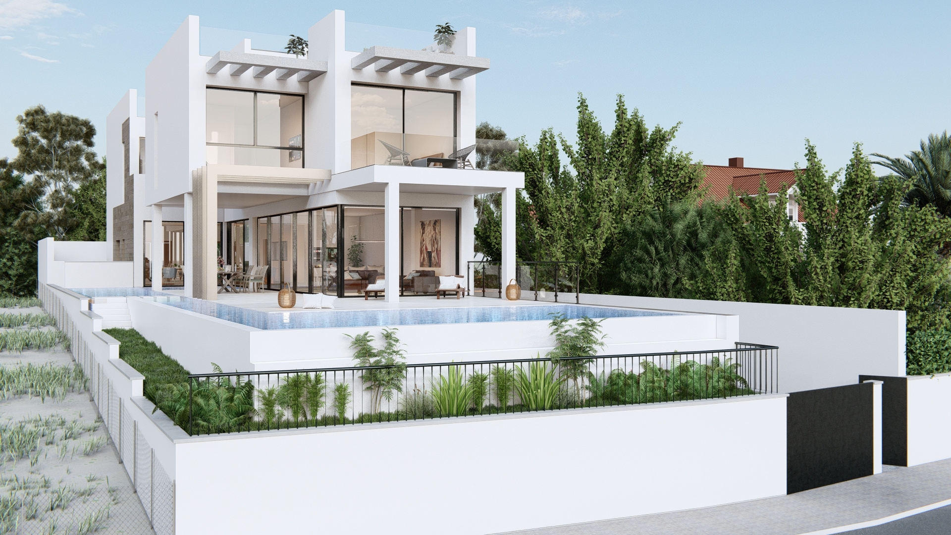 The house has nearly 300 square metres, distributed over two floors on a plot of 690 square metres. In total 4 bedrooms, 6 bathrooms, access with double height, open kitchen, large living room with porch, swimming pool with splash pool area, basement and large terrace on the ground floor.