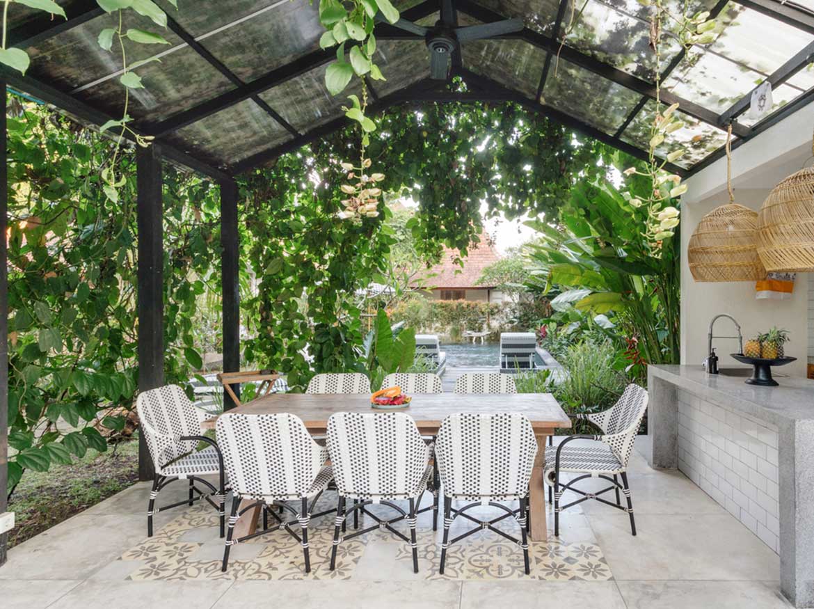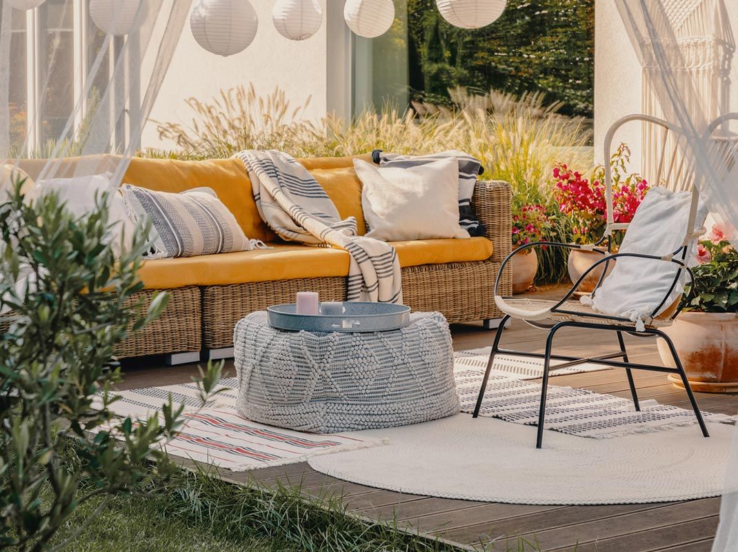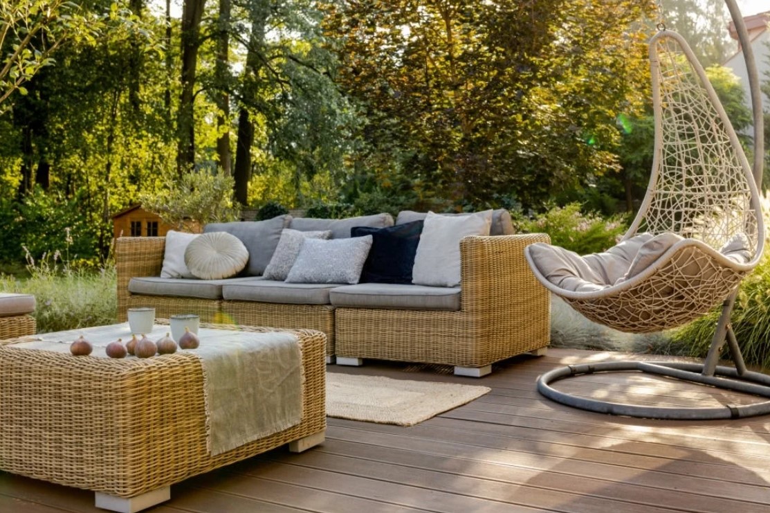 Pero, si el estilo que quieres en tu zona exterior es más clásico, los muebles con acabados naturales son lo que estás buscando. Sofás de madera, mimbre o ratán son los elegidos para estas zonas comunes. Un punto que hay que tener en cuenta a la hora de elegir este tipo de materiales es que tiene que estar cubierta la zona, ya que los rayos del sol o la lluvia pueden deteriorarlos.